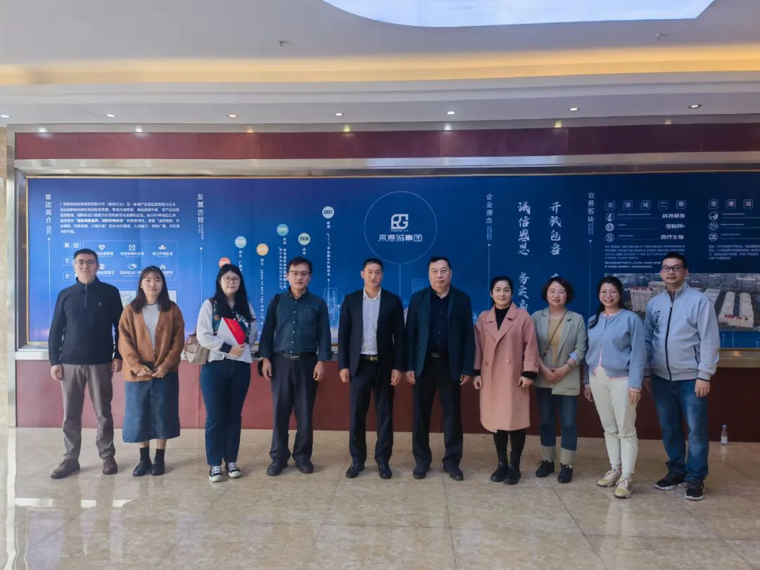 ▲廣西榮港城發(fā)展集團(tuán)有限公司董事長王明軍(左5)與南寧學(xué)院商學(xué)院黨委書記吳忠(右5)、工商管理教研室主任黃琦(右1)等進(jìn)行合作交流