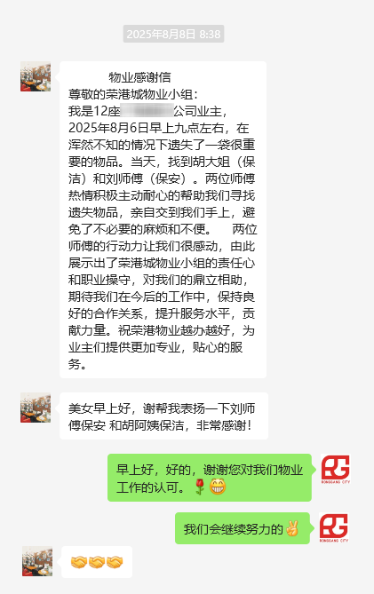 8月6日上午九點(diǎn),客戶在渾然不知的情況下遺失了一袋很重要的物品。當(dāng)天,客戶找到物業(yè)部保潔胡大姐及保安劉師傅,兩位工作人員熱情積極,并主動(dòng)耐心的幫助客戶尋找遺失物品。找到遺失物品后第一時(shí)間上門(mén)親自交到客戶手上,為客戶避免了不必要的麻煩和不便。
